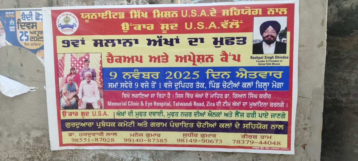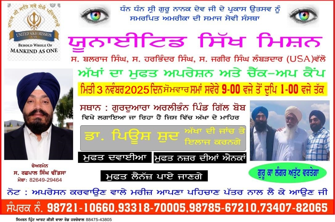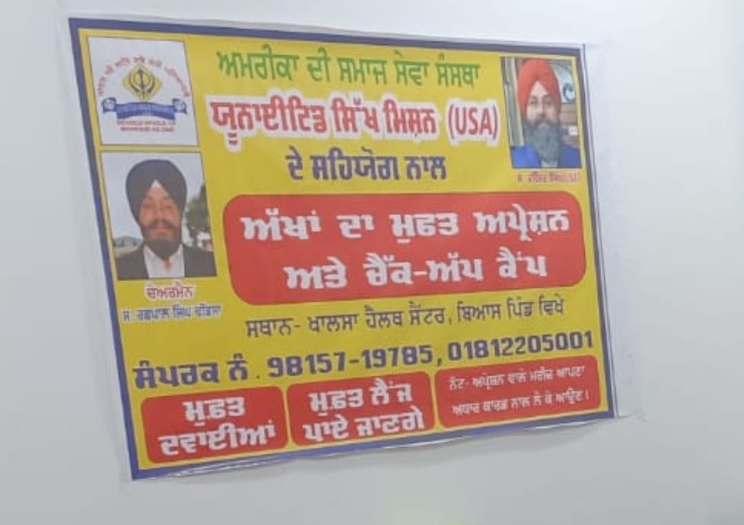 The United Sikh Mission announces the establishment of a free charitable hospital named Khalsa Health Center in Bias Bind, Jalandhar, Punjab. This charitable hospital in Village Bias Pind, Jalandhar (on the Jalandhar-Pathankot Highway) aims to provide year-round care for all eye-related surgeries, dialysis, gynecological treatment, and pharmacy services.